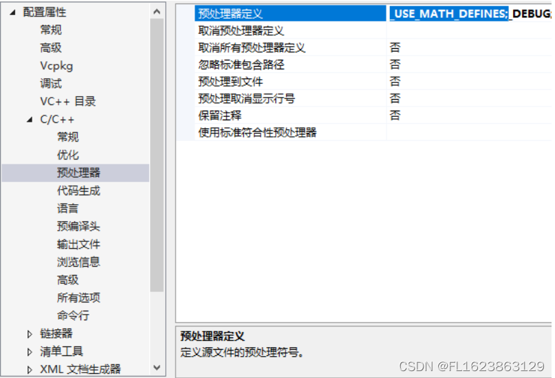 _USE_MATH_DEFINES。注意,最佳方案就是在属性页面里添加此宏。如果只是在项目的某个文件头部加了一句#define _USE_MATH_DEFINES,很可能是没用的。