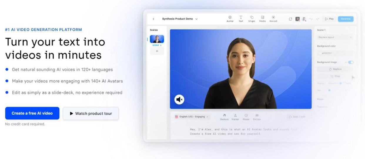 工具介绍:Synthesia 是只需输入文本,即可驱动AI虚拟人像“开口说话”,生成逼真的讲解类、培训类或产品介绍视频。支持120+语言和多种数字人形象,无需拍摄、无需出镜,广泛应用于企业培训、教育和电商领域。