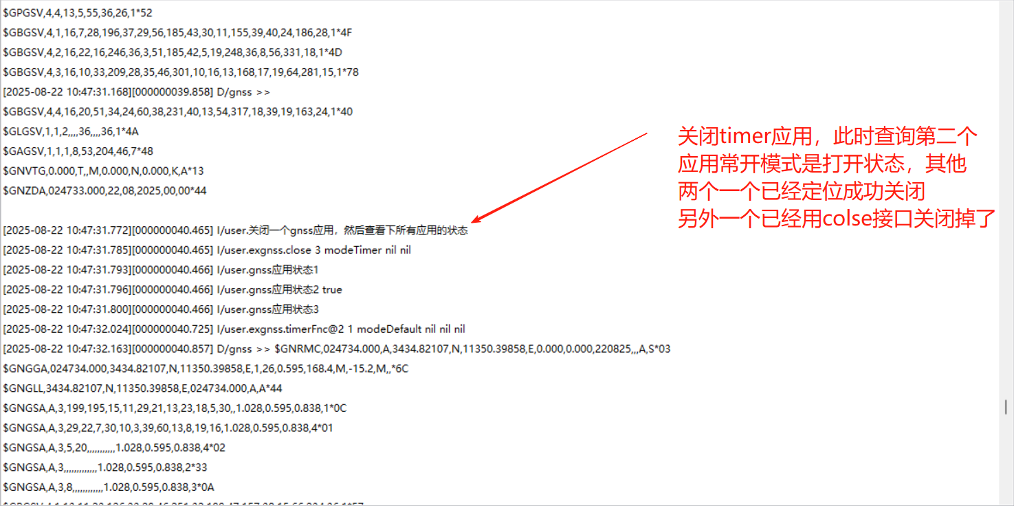 关于应用需要注意的是:使用 exgnss.close()关闭的只是对应的应用,所有应用关闭,gnss 也会关闭,这样做的好处是可以处理不同场景下的不同逻辑,比如服务器下发一条定位指令,定位成功之后关掉,这个时候又下发了一个指令需要长开启定位,这样两种指令就会冲突,需要代码去处理到底是不是要关掉 gnss,这个时候应用的好处就体现出来了,开启 exgnss.TIMERORSUC 第一个应用,定位成功之后关掉对应的应用,同时开启 exgnss.DEFAULT 第二个应用,gnss 就会常开,在应用 1 结束之后,只会对应用进行自动关闭,不会影响到第二个应用,gnss 还会处于常开状态。