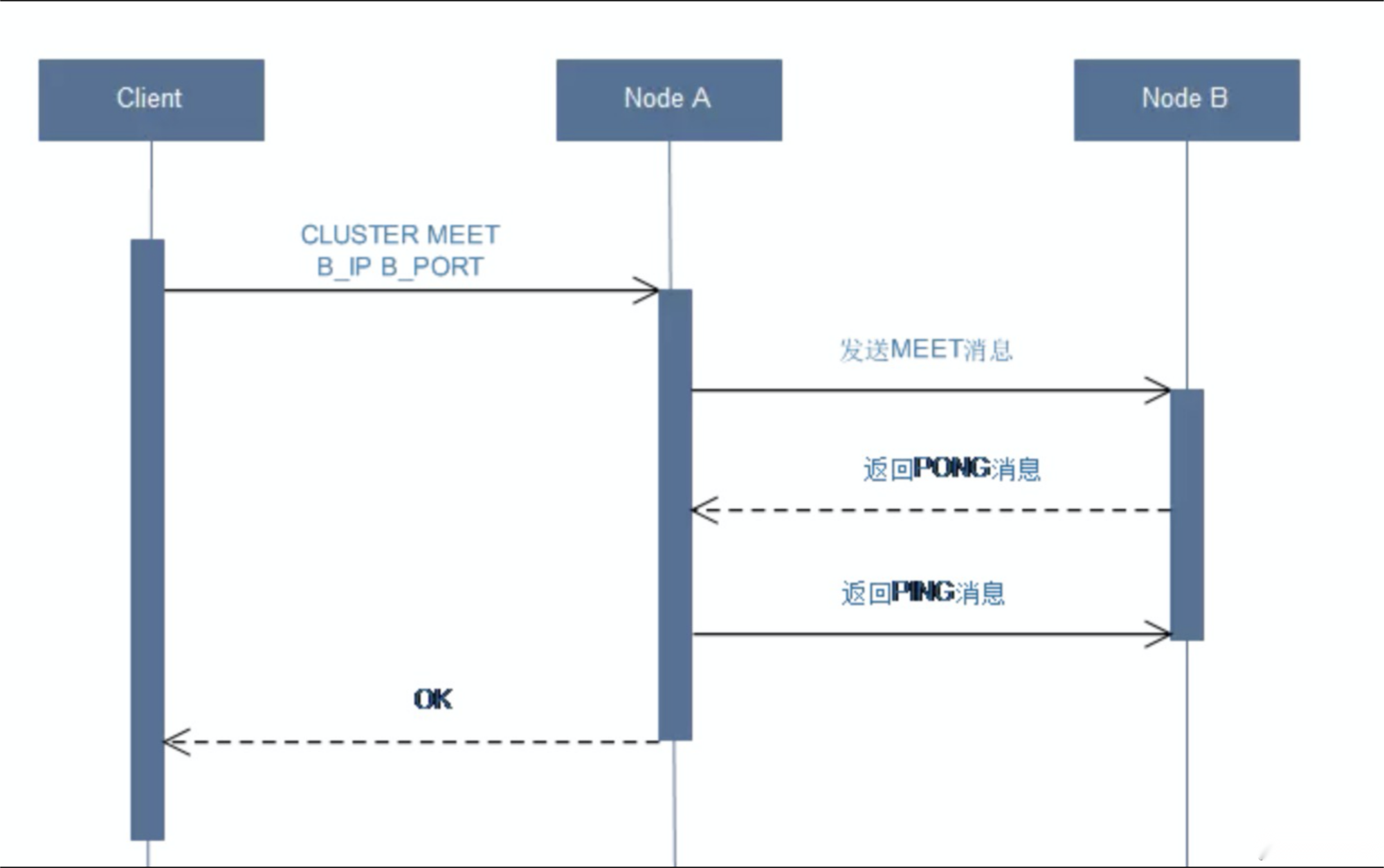 节点A根据CLUSTER MEET命令给定的IP地址和端口号,向节点B发送一条MEET消息。