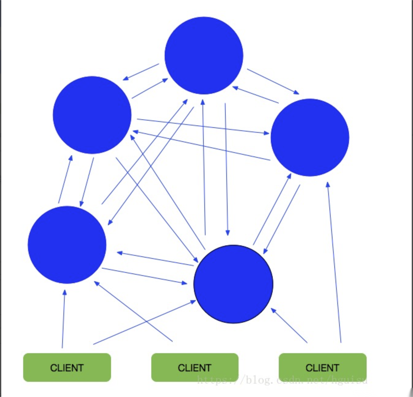 在这个图中,每一个蓝色的圈都代表着一个redis的服务器节点。它们任何两个节点之间都是相互连通的。客户端可以与任何一个节点相连接,然后就可以访问集群中的任何一个节点。对其进行存取和其他操作