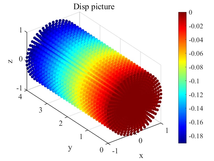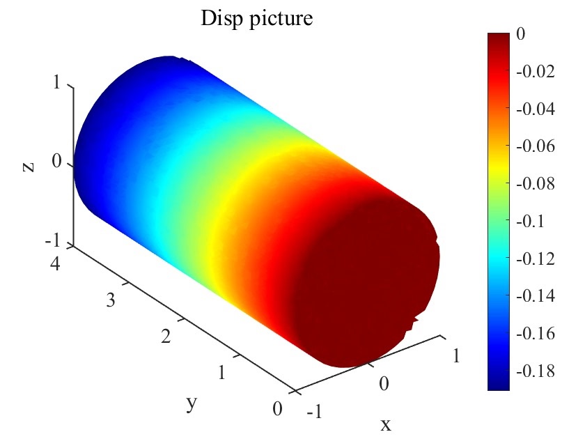 - 数据读取与预处理:Matlab脚本读取displacement.dat文件中的结构化数据,分别提取坐标列(X、Y、Z)与位移列(disp),并计算位移数据的最大值与最小值,为后续颜色映射提供范围依据;