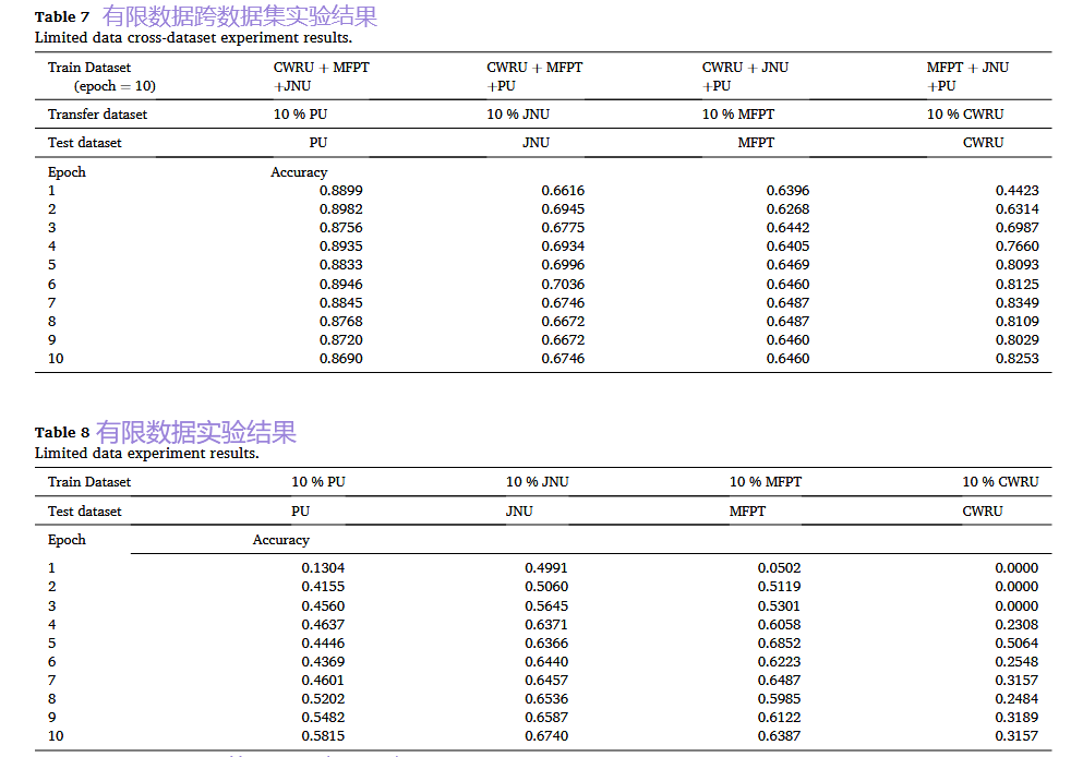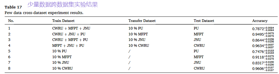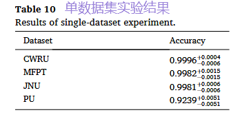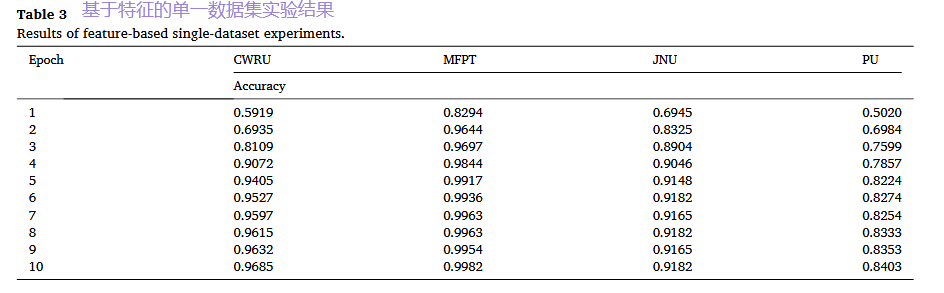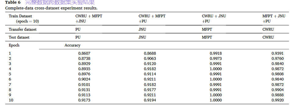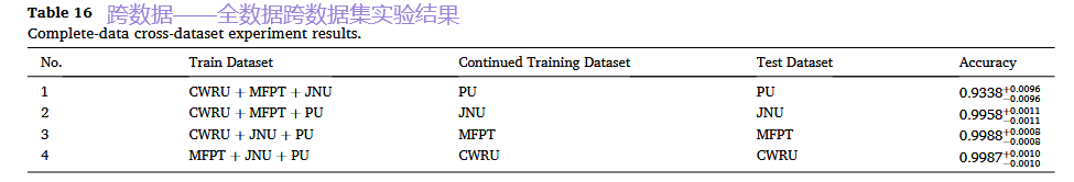 设计: 在三个数据集上联合训练模型,然后在第四个完全未见过的数据集上进行测试。例如,用CWRU、MFPT、JNU训练,在PU上测试。