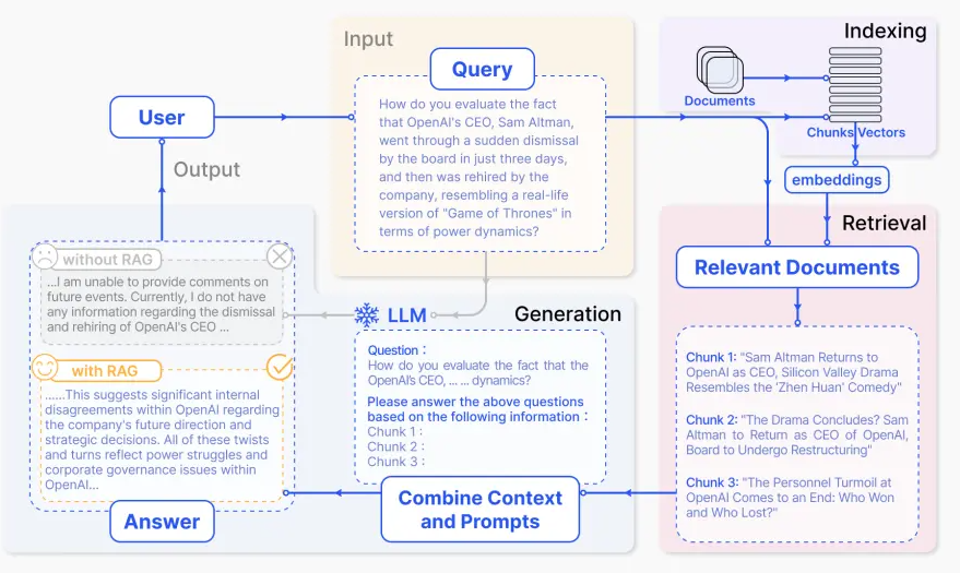 - Generation => 如何结合用户的提问和检索到的知识,让模型生成有用的答案。