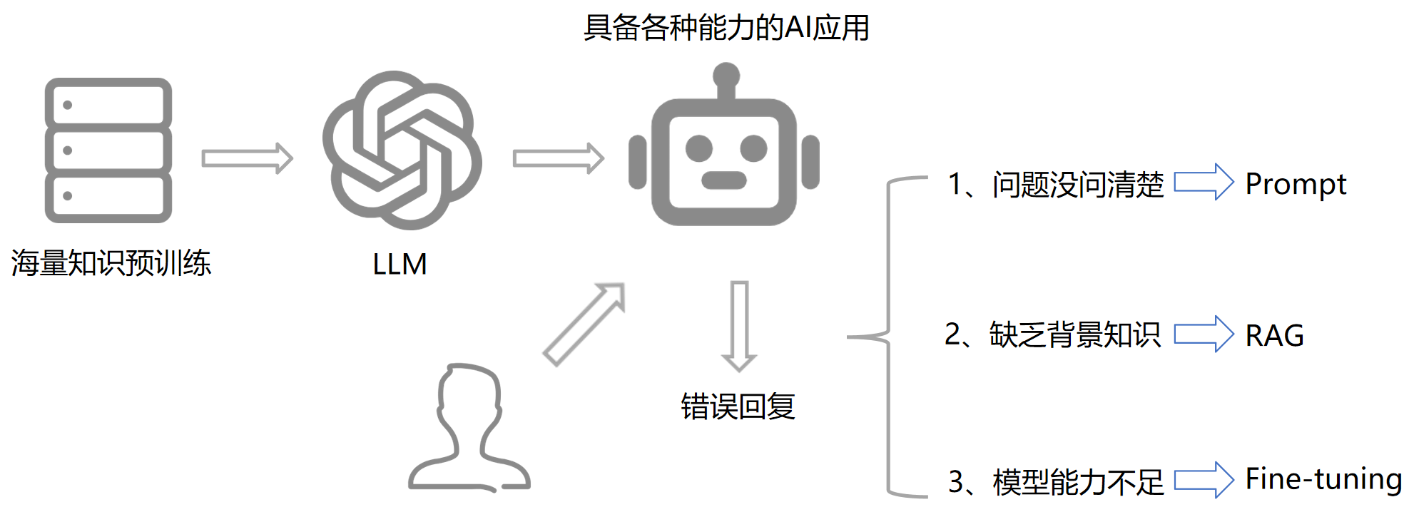 三种手段的具体应用场景如下图所示。图中 LLM 指的是大模型。