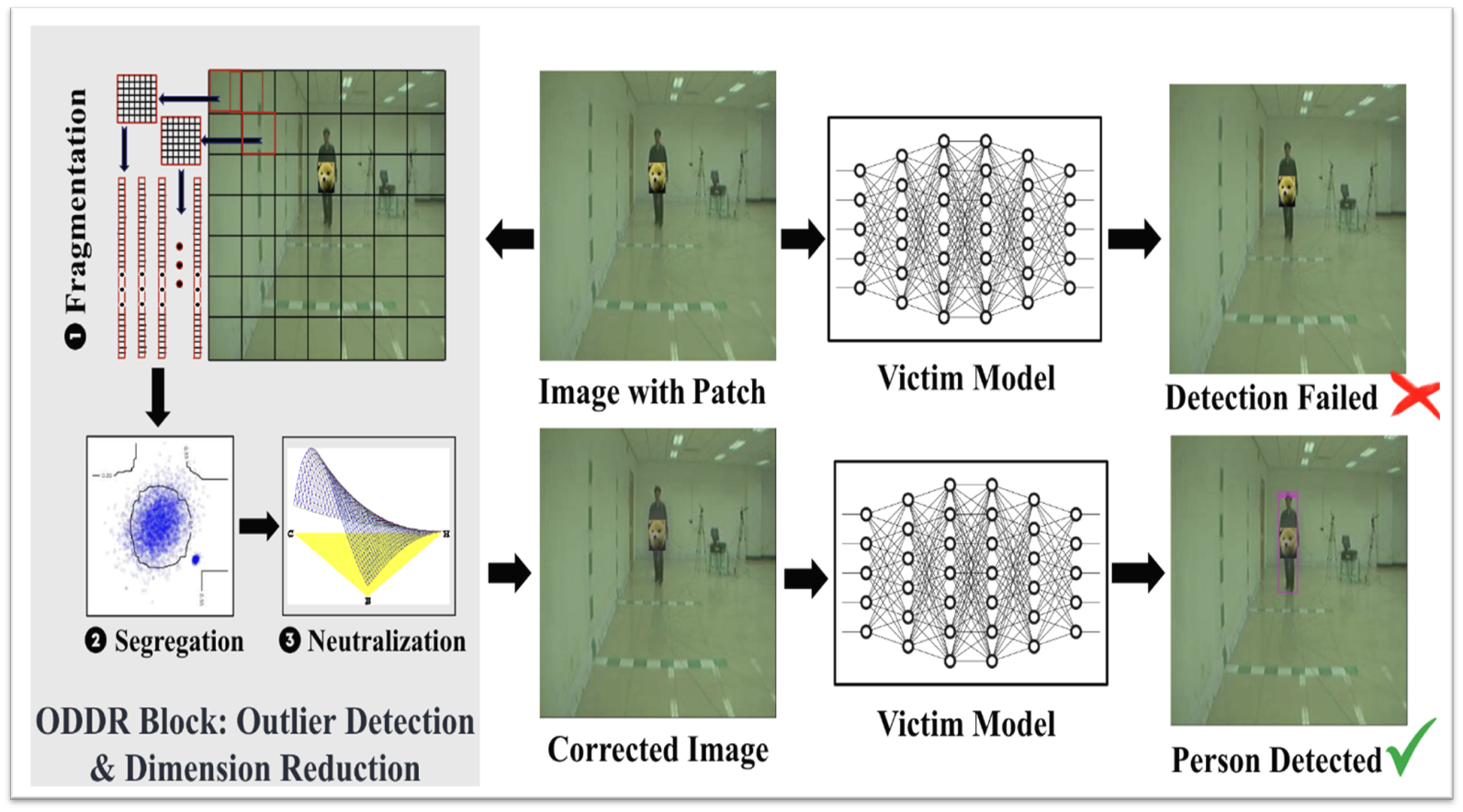 ODDR(Outlier Detection & Dimension Reduction)是一种模型无关的防御策略,基于 “对抗性补丁对应的输入特征偏离图像其余数据的固有分布,可被识别为异常值” 的核心观察,通过三阶段 pipeline 实现防御,流程如图所示。碎片化、隔离和中和