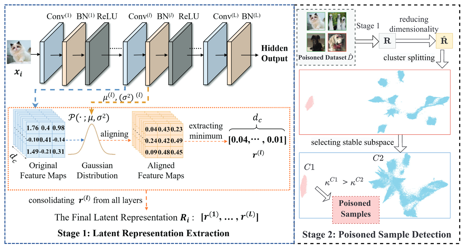 - 异常特征提取:后门特征易引发极端激活值,从每个对齐后的特征图中提取最小值(代表异常),并整合所有隐藏层的最小值,形成样本的最终 latent 表示\(R_i\)。