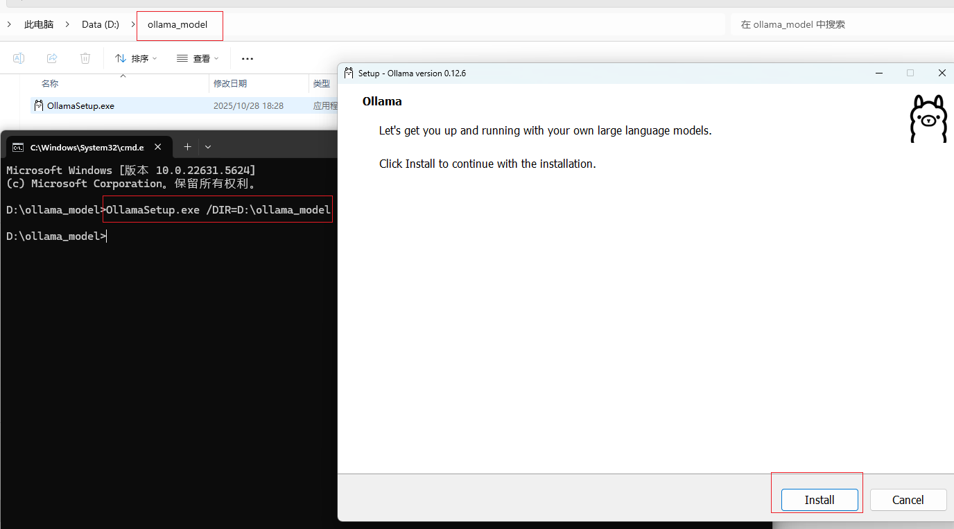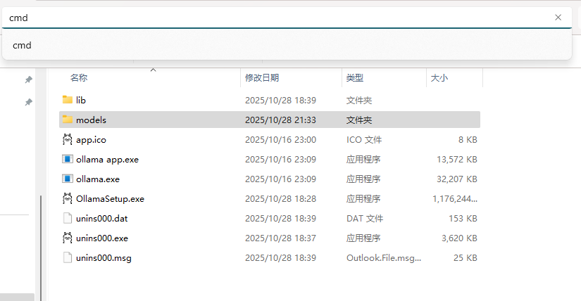 在OllamaSetup.exe所在目录打开cmd命令行,然后命令如下: