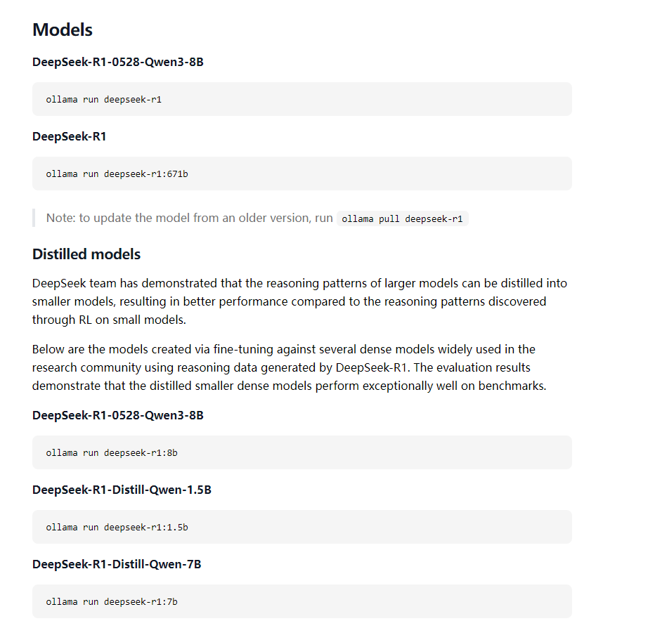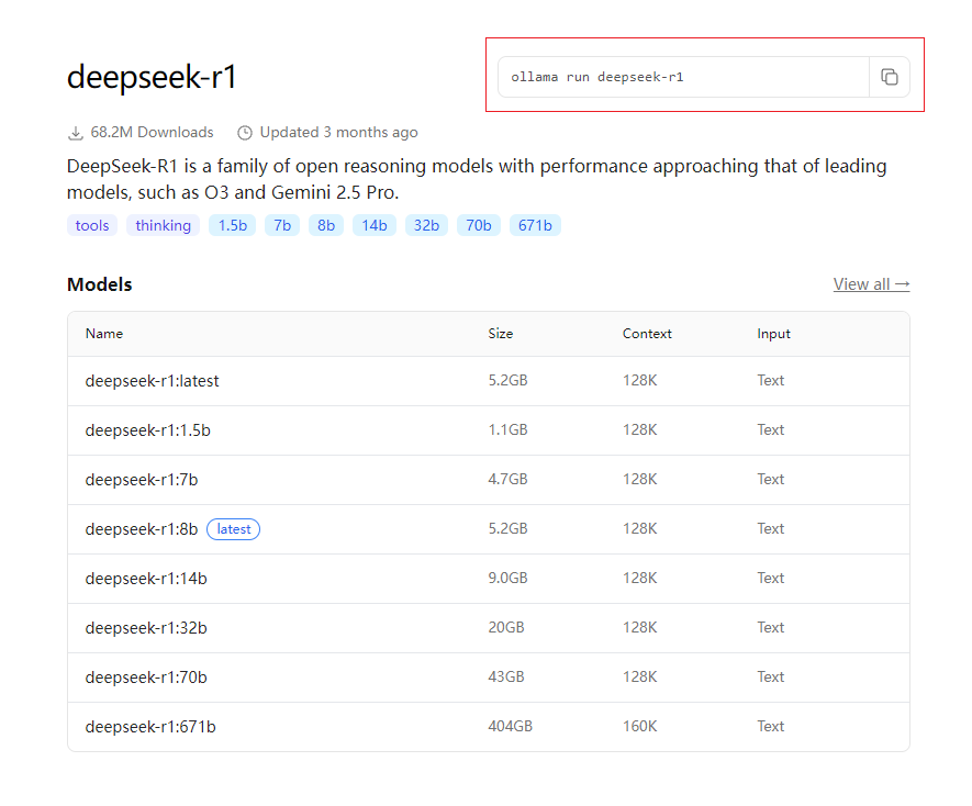 下载期间我们可以看一下ollama左上角的Models,可以看到各种模型,随便点击一个模型进入详情页,可以看到各种版本和大小,以及运行的指令,学过docker的同学一个很熟悉这些指令的语法,是的,跟docker类似。