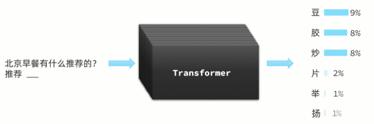 然后是T,使用Transformer对输入的一些文本、音频、图片信息尝试进行推理接下来的内容,以概率发布形式出现