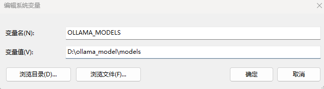 安装后,退出客户端(quit ollama),然后配置环境变量,设置ollama模型的存储路径