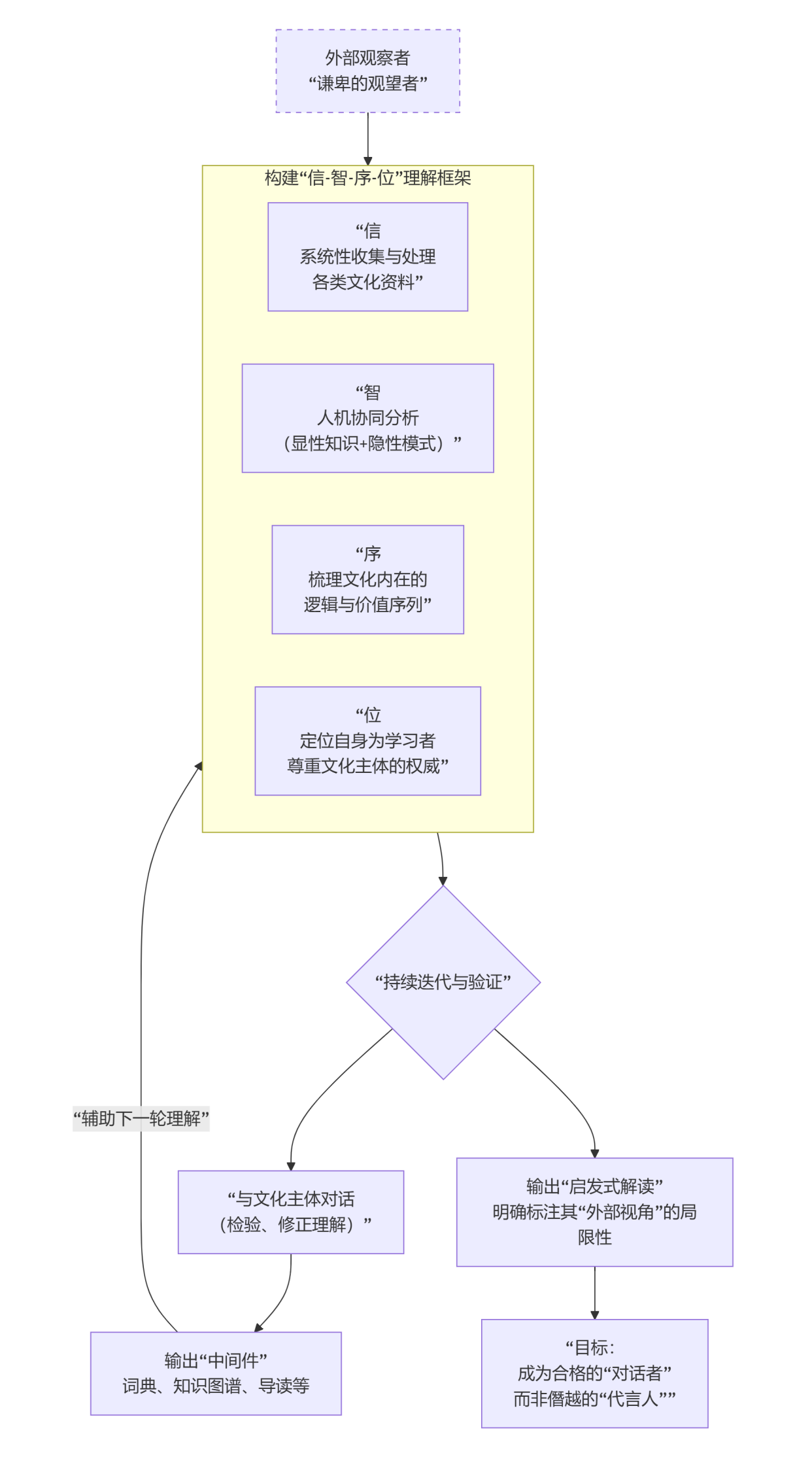 下图描绘了在融智学范式下,外部观察者如何通过一套系统的方法,尽可能逼近对目标文化的深度理解: