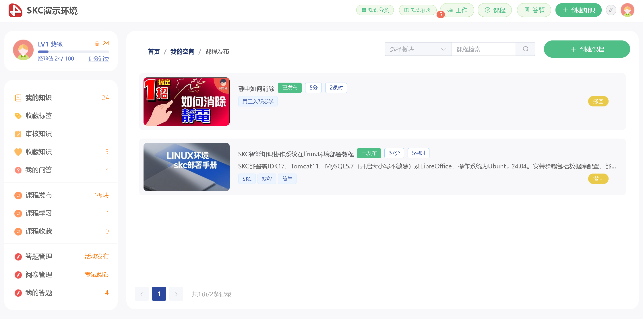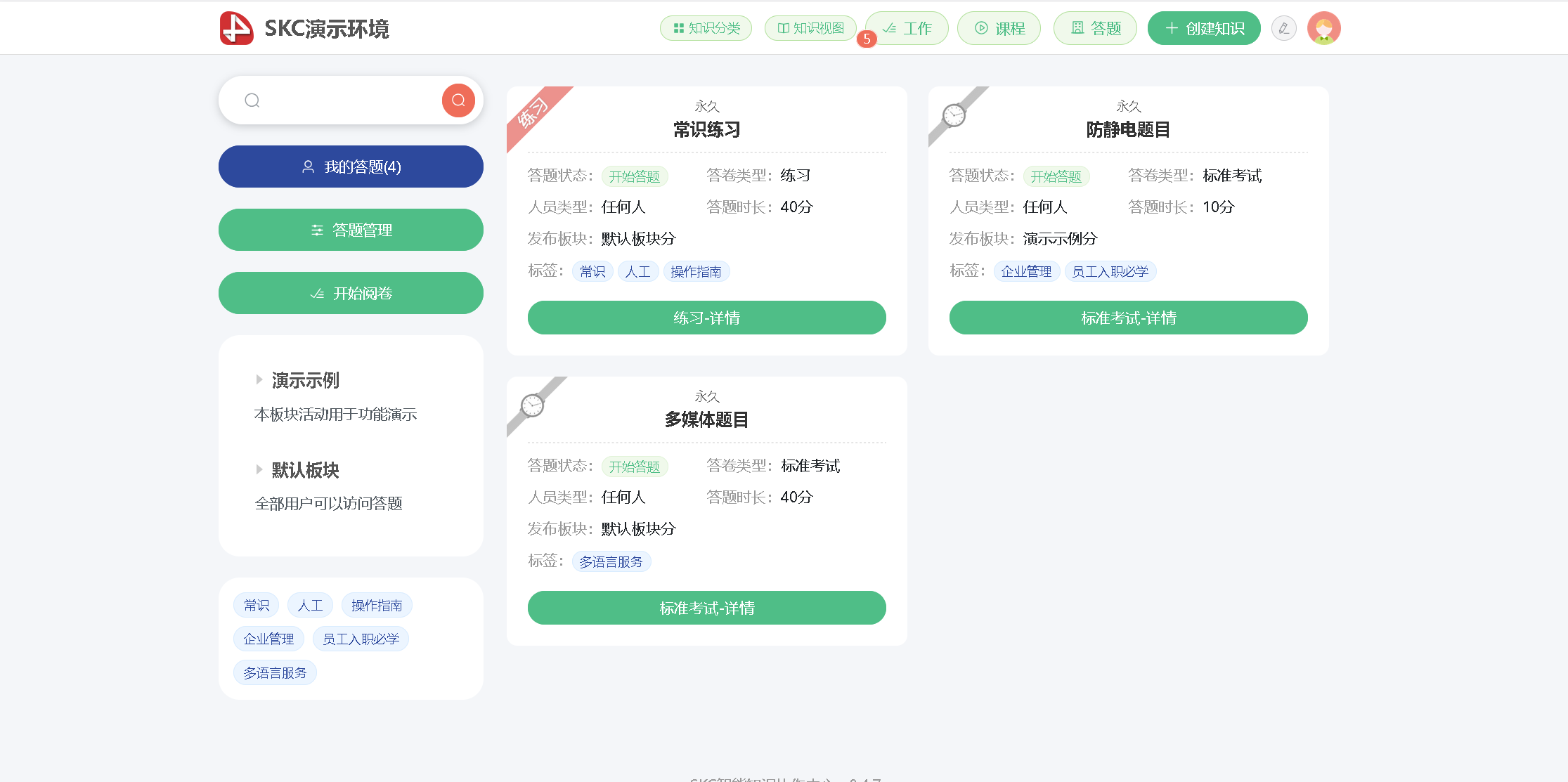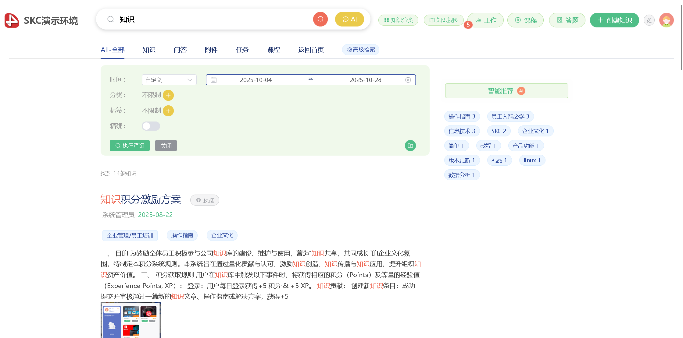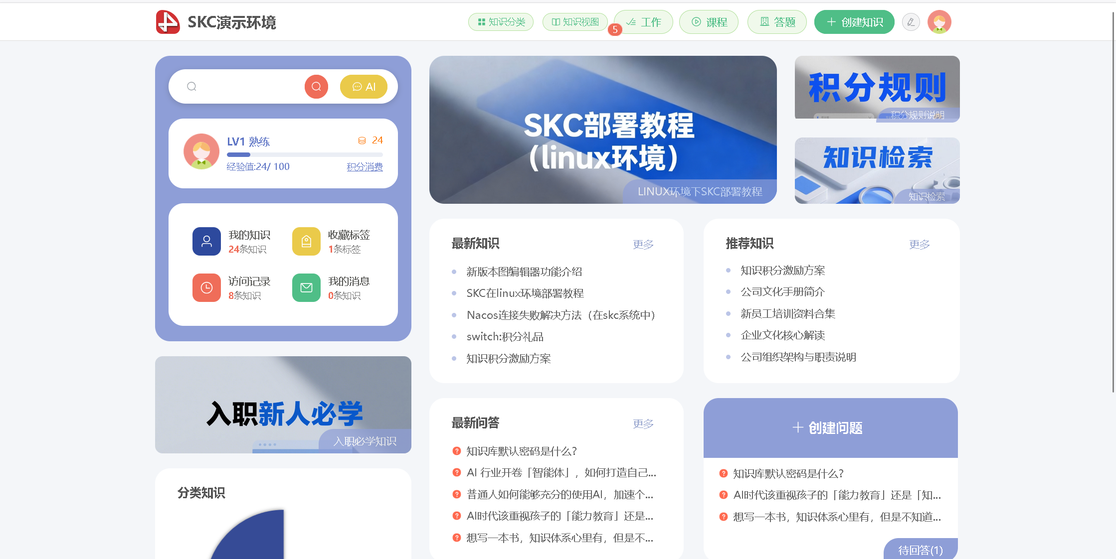 SKC 智能知识管理系统,支持文档、任务、问答、课程等多类型知识统一沉淀与智能检索,私有化部署,安全可控。