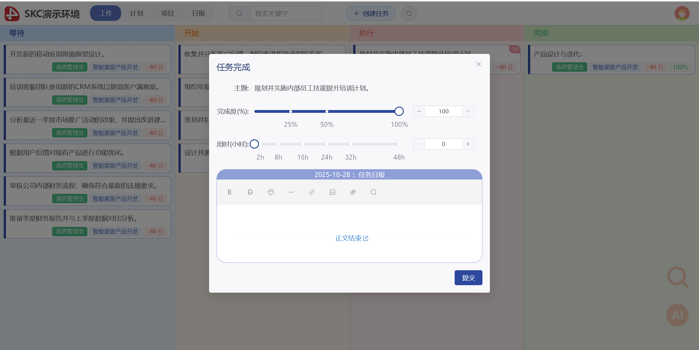 - 任务日报:基于实际任务状态,自动生成个人/团队日报,AI可汇总周期报告;