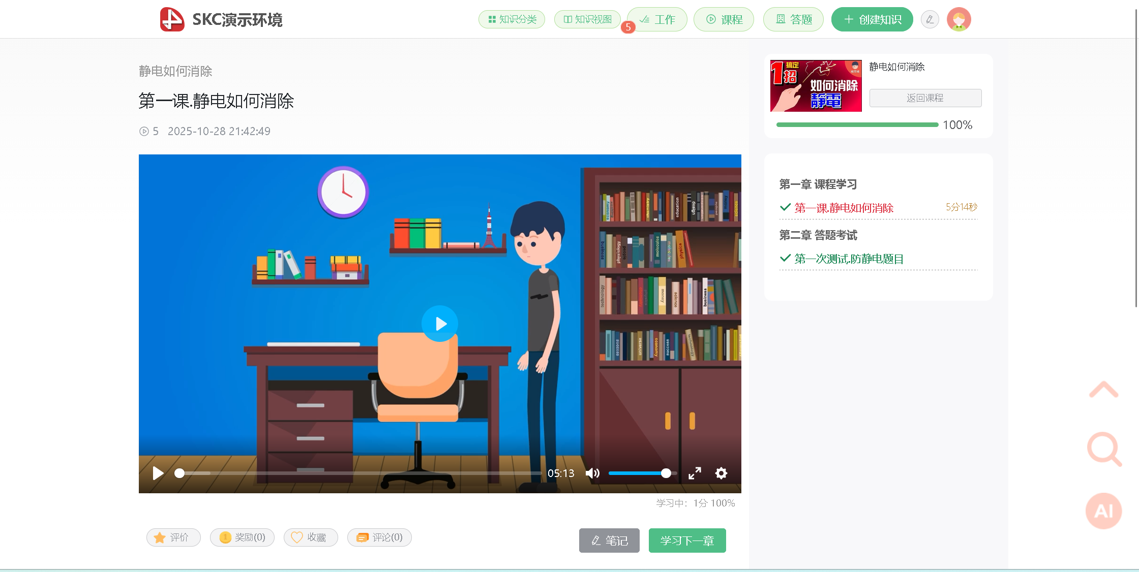 - 课程学习:把一篇知识设为课程课时,员工学习后记录进度、做笔记、参加考试;