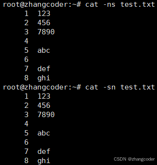 解:显然是cat的两个选项的组合 -n和-s