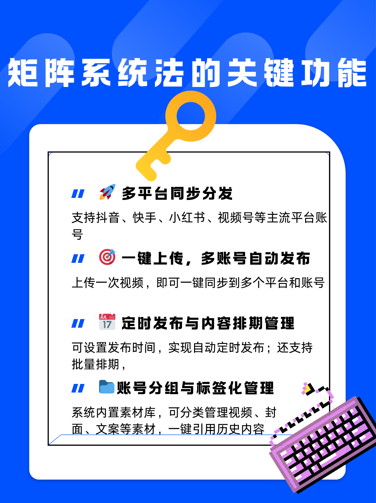 在抖音、快手、小红书、视频号、B站等平台竞争日益激烈的背景下,矩阵系统的价值体现在三个核心点上: