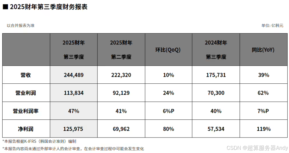 当 SK 海力士 2025 财年第三季度财报出炉,一组数据瞬间引爆科技圈:营业收入 24.4489 万亿韩元(同比 + 39%)、营业利润 11.3834 万亿韩元(约 563.14 亿元人民币,同比 + 62%)、净利润 12.5975 万亿韩元(约 623.2 亿元人民币,同比 + 119%),营业利润率 47%、净利润率 52%,营业利润更是首次突破 10 万亿韩元。这不仅是 SK 海力士的