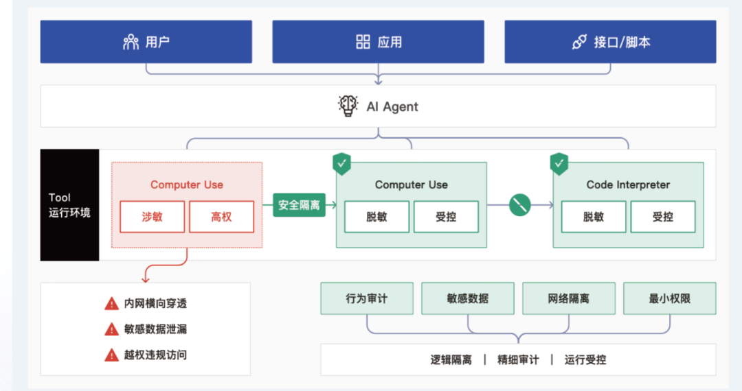 Tool 是 Agent 的 “手脚”,高危 Tool(比如:内网数据读写、代码执行)必须运行在受控环境中,实现 “彻底隔离 + 精细审计”,确保即便被劫持,也无法危害核心系统。