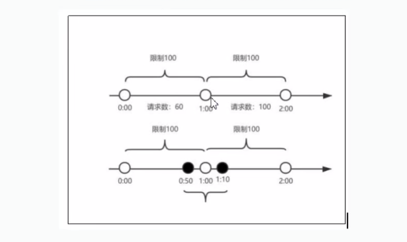 存在临界问题,图中,在0:00到1:00内,只在0:50有60个请求,而在1:00到2:00之间,只在1:10有60个请求,虽然在两个一分钟的时间内,都没有超过100个请求,但是在0:50到1:10这20秒内,确有120个请求,虽然在每个周期内,都没超过阈值,但是在这20秒内,已经远远超过了原来设置的1分钟内100个请求的阈值。