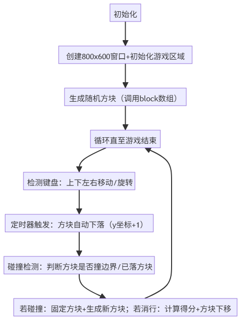 initgraph(800, 600)窗口代码,附带库链接命令,新手不用管编译器配置 - 02 方块生成与控制(视频12:11-22:40):提取“7种方块的二维数组定义”“上下左右移动逻辑”,标红“方块旋转时的边界检测”,避免抄代码漏写数组元素