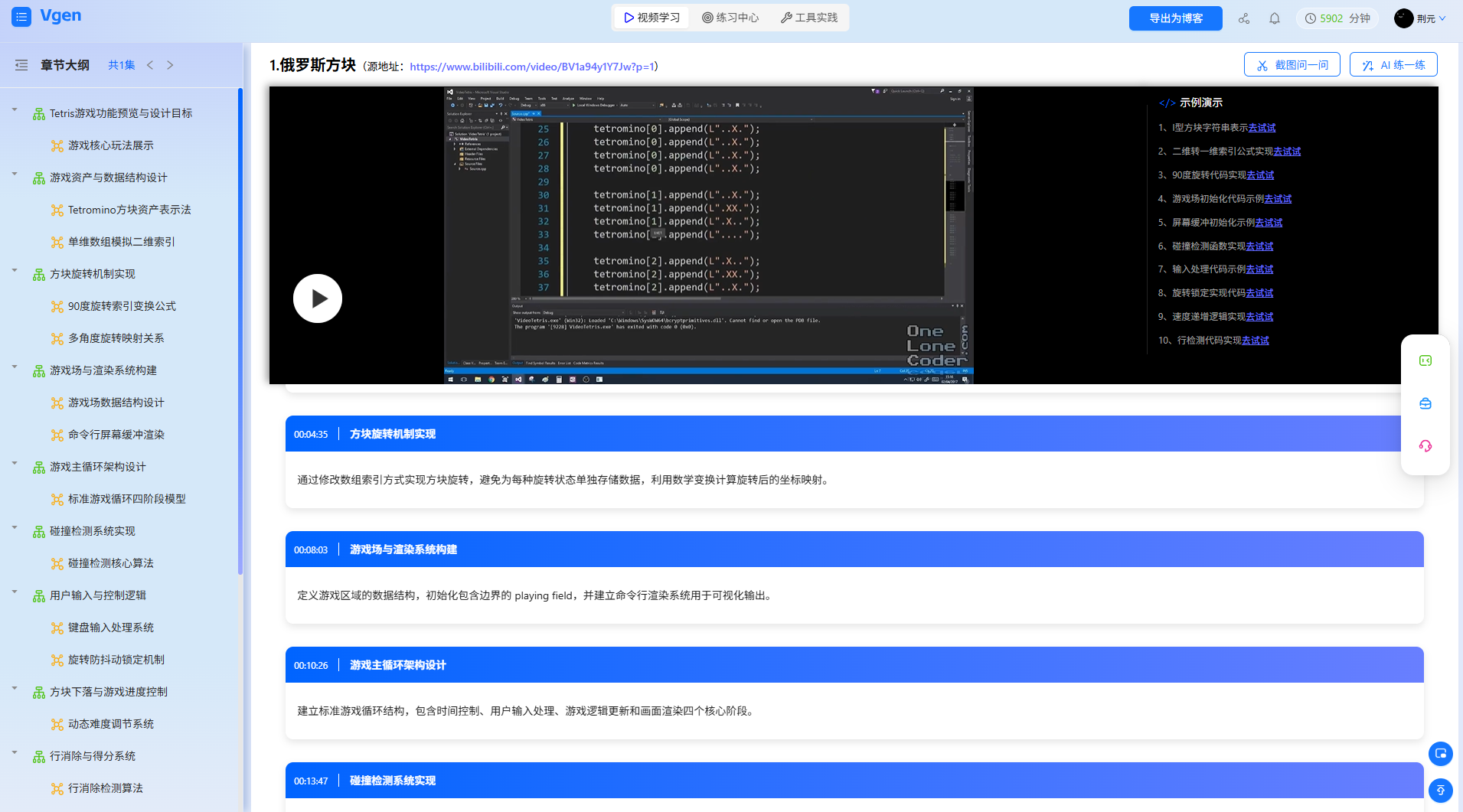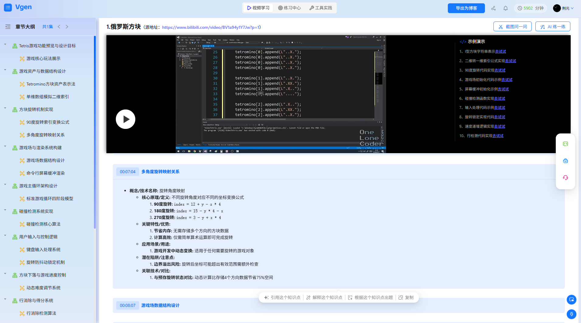 国外教程的痛点是“节奏慢、冗余多”——40分钟视频里,15分钟讲工具下载、10分钟闲聊游戏历史,真正有用的“方块生成、碰撞检测、消行逻辑”只占15分钟。智能视频解析工具能进行知识点结构化处理,直接“过滤水分”,把核心内容拆成3个新手必学模块,每个模块都瞄准游戏开发的关键卡点,比硬啃完整视频快8倍。