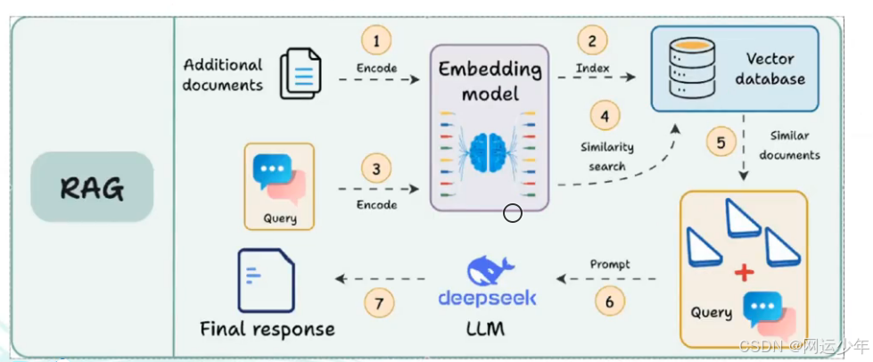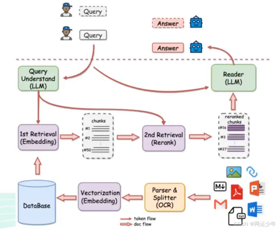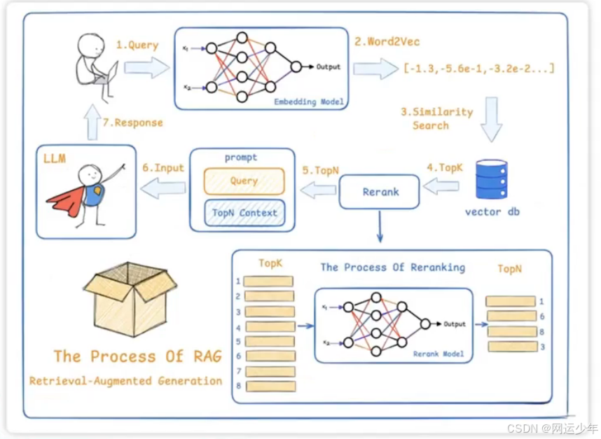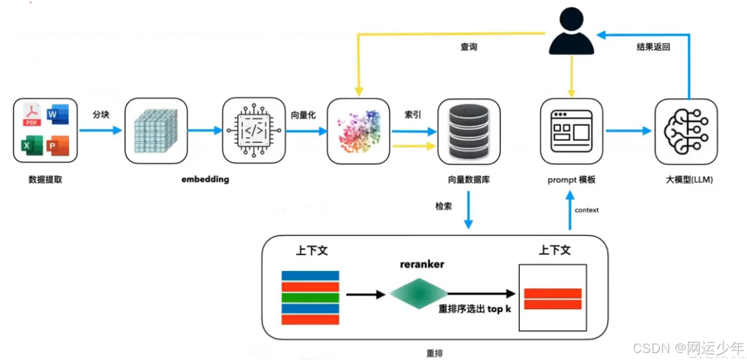 如上图所示,整个RAG过程中会主要用到两模一库,即两个模型:embedding模型(词嵌入模型,也叫向量转换模型)、rerank模型;一库:向量数据库。