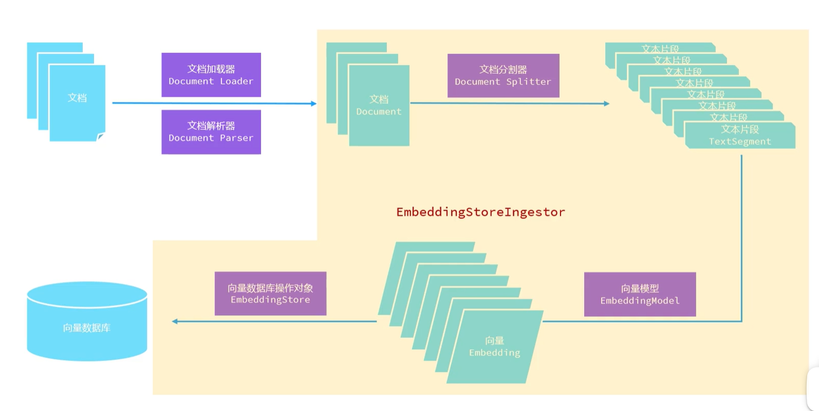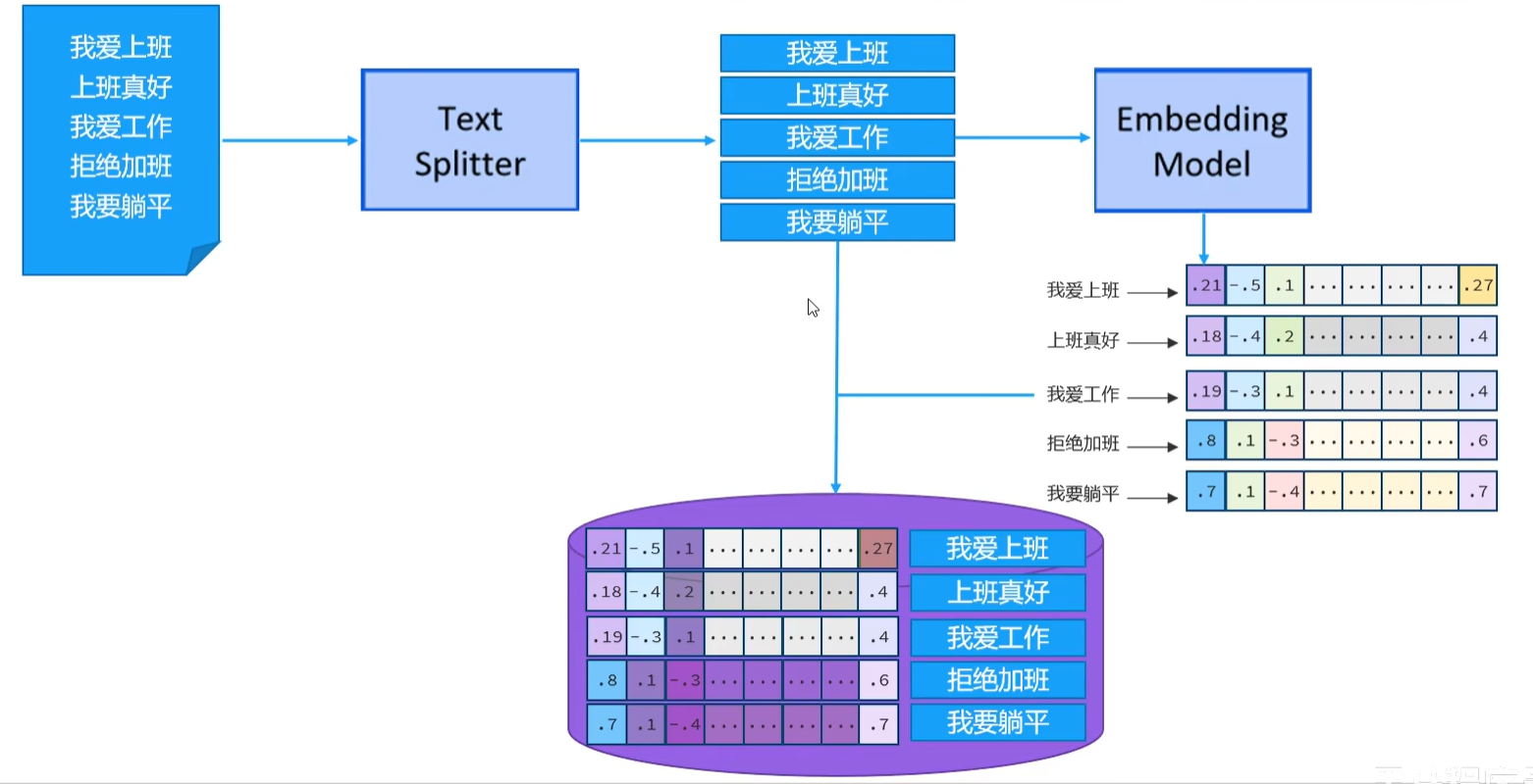 1. 把最新或者专业的数据存储到文档(Document)中 2. 文本分割器把一个大的文档切割成一个一个小的文本片段(Segments) 3. 这些小的文本片段需要用一种专门擅长文本向量化的向量大模型转换成向量(Embeddings) 4. 把文本片段对应的向量存储到向量数据库(Embedding Store)中