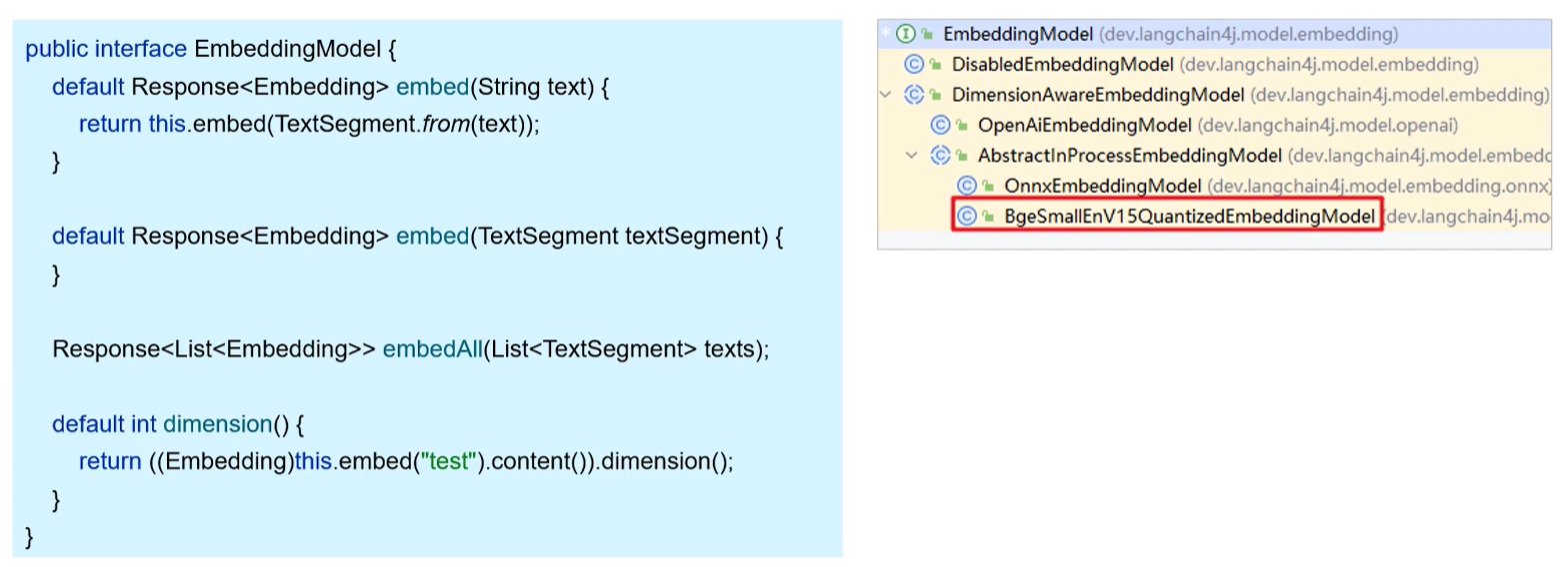 用于把文档分割后的片段向量化或者查询时把用户输入的内容向量化 Langchain4j 内置的向量模型