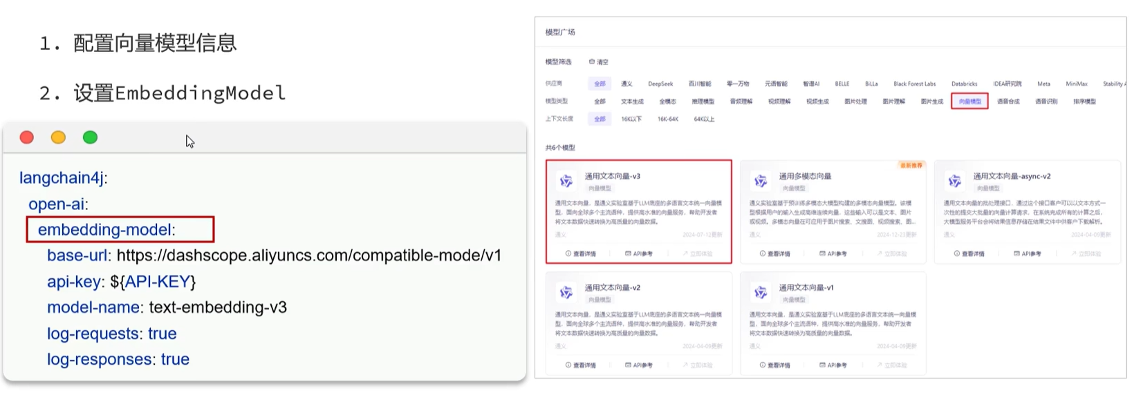 配置完成后 Langchain4j 会根据配置信息向容器中注入一个向量模型对象,我们只需要把该向量模型对象设置给`EmbeddingStoreIngestor`和`EmbeddingStoreContentRetriever`即可。