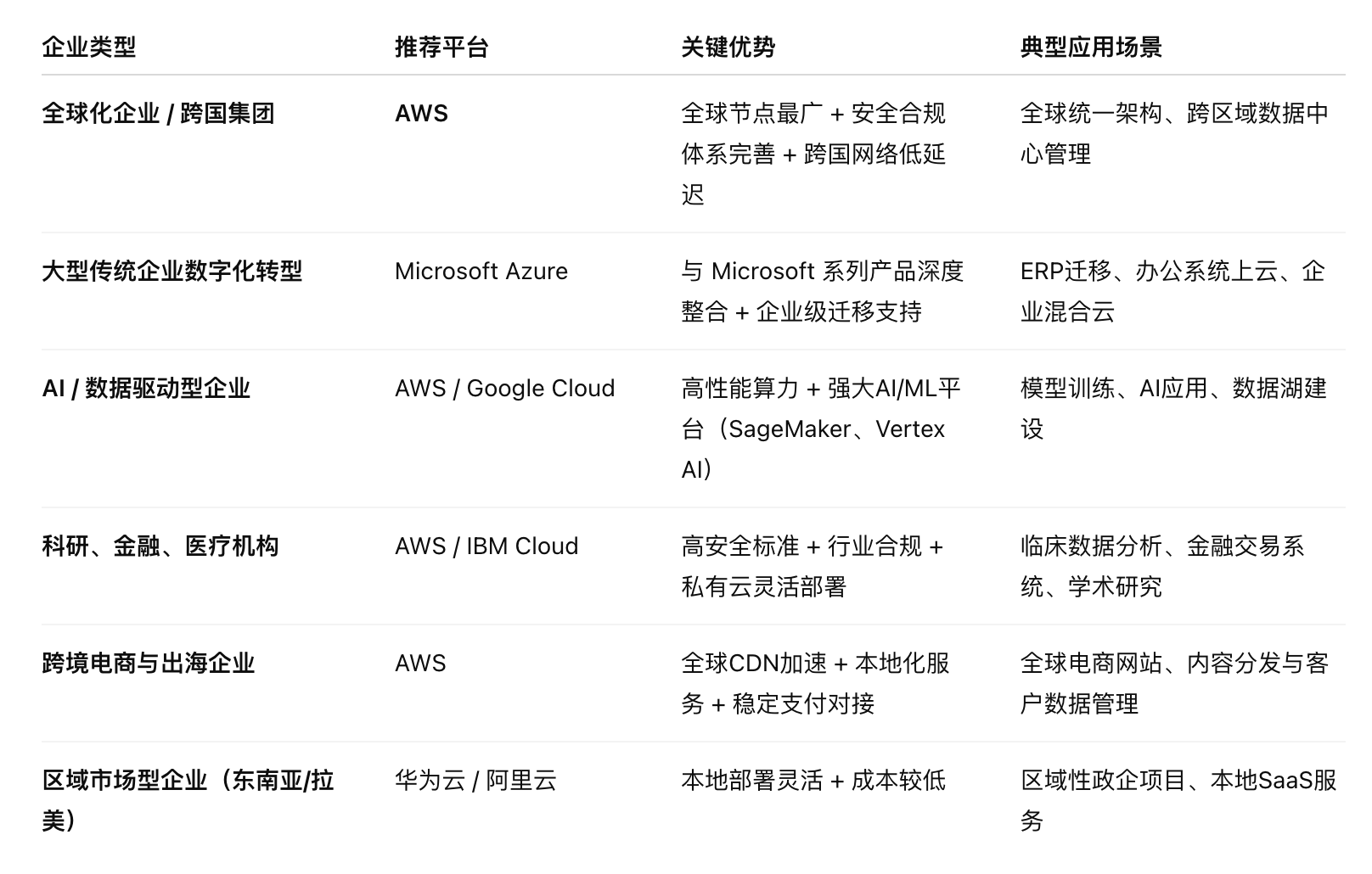 ➜ 可考虑在华为云或阿里云上做初期部署,再以 AWS 构建海外镜像节点,实现内外分层、数据合规的混合架构。 - 如果企业以AI和数据分析为战略重点