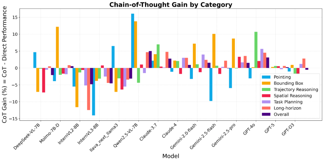 Chain-of-thought在很多子能力在闭源模型上起到一致的负面作用,比如给点和空间推理能力。作者分析给点是一个直接的表达方法,模型只需要输出一个正则之后的x和y,过度的推理给模型引入不必要的干扰。同时,人们在进行空间推理的时候常常使用“直觉”,引入推理链有时会使模型引入一些错误的空间表达和位置关系,在推理最终答案的时候起到了负面作用。