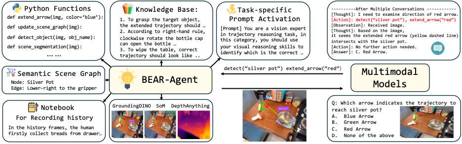 基于上面的发现,作者团队意识到,增强模型的视觉能力,可以全面提高模型的具身推理能力。在多模态领域,已经有一些工作通过画辅助线和教会模型使用工具用来求解数学问题。受这样工作的启发,作者开发了BEAR-Agent,这是一个可对话的多模态智能体,主要通过提供工具和做辅助线的方式增强模型的视觉推理能力,进而提升模型的具身推理能力。作者选取了表现最好的开源模型和闭源模型,InternVL3-14B和GPT-5,BEAR-Agent可以显著提高他们在BEAR上的performance。