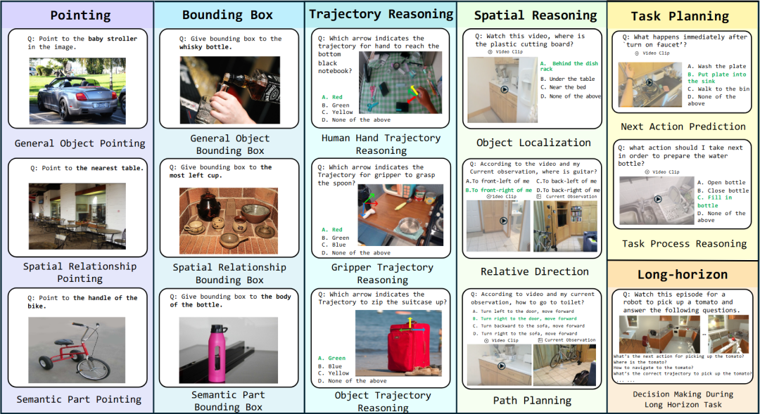 BEAR涵盖了4,469个图片-视频-文字的VQA。BEAR涵盖6个大类,其中包括5个基础类别,包括给点(Pointing), 给检测框(Bounding Box), 空间推理(Spatial Reasoning),任务规划(Task Planning),并且在每个类别下面还有不同子技能,如给点分为普通物体给点,空间关系给点和局部给点,共分为14个技能,见下图。除此之外,我们引入第六个长程推理类别,首次将具身智能的任务切分为以14个不同技能划分的步骤,涵盖了智能体在完成一个任务中所需要具备的技能。