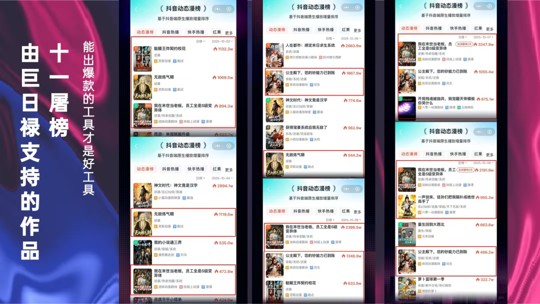 近期,巨日禄AI短剧漫剧创作工具(内容生产已进入全新纪元——亿级播放爆款或许才刚刚拉开这场生产力革命的序幕,AI短剧AI漫剧正以惊人的速度成为内容产业的新风口。的巨日禄AI短剧漫剧创作平台,已成为催化并引领行业变革的先锋。近期,多部由巨日禄AI技术支持的漫剧在各大平台取得了令人瞩目的成绩。《无限返还:我买爆了诡异末日》10月27日断层播放量第一,表现抢眼,上线仅5天便获得超1.1亿播放量。