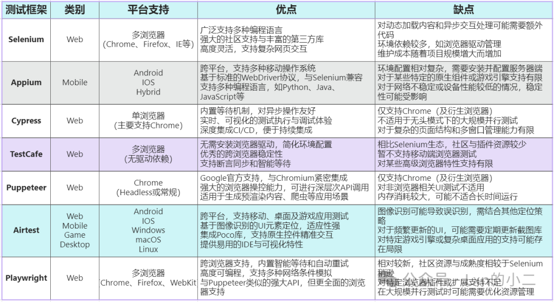依托于当前技术快速迭代,系统快速更新,市面上诞生了众多开源测试框架。笔者分别对当下较为主流的几款测试框架进行了实际测试和深入了解。仅以笔者的个人需求整理汇总如下: