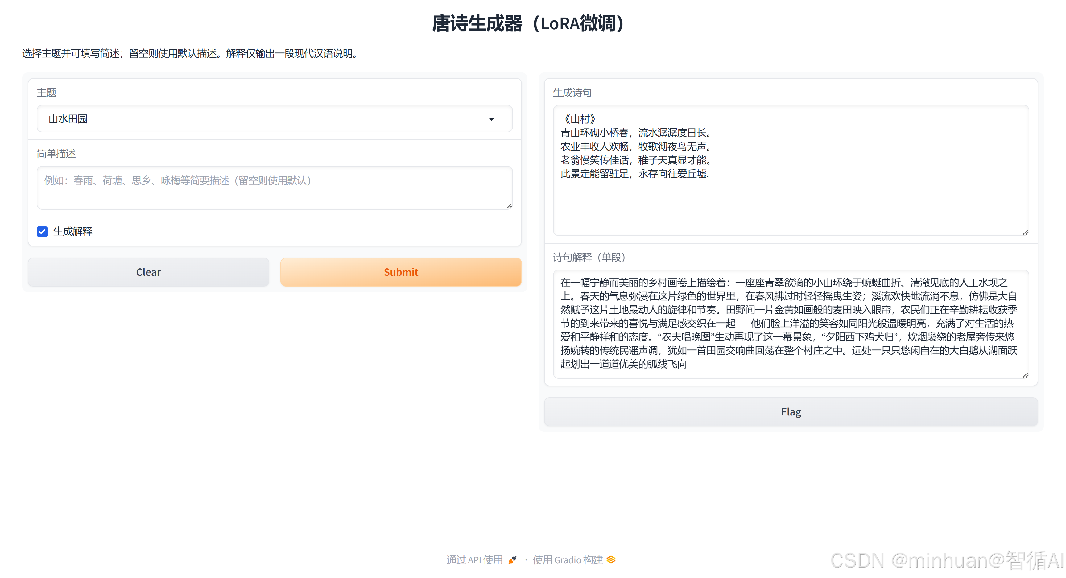 """构建Gradio界面:主题选择 + 简单描述(留空则默认),生成诗句与单段解释"""