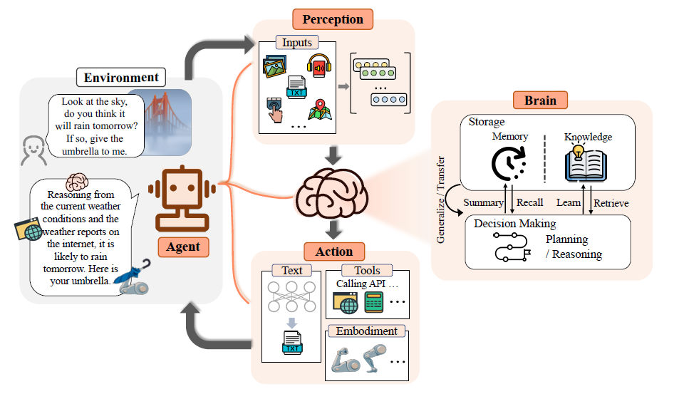 AI Agent 的定义,可参考复旦大学的综述论文《The Rise and Potential of Large Language Model Based Agents A Survey》:基于大型语言模型(LLM)的 AI 智能体(LLM-based AI Agent)是指利用大型语言模型作为核心组件,具备感知环境、自主决策和执行任务能力的人工智能系统。这些智能体通过结合规划、记忆和工具使用等模块,使其能够在动态环境中完成复杂任务。
