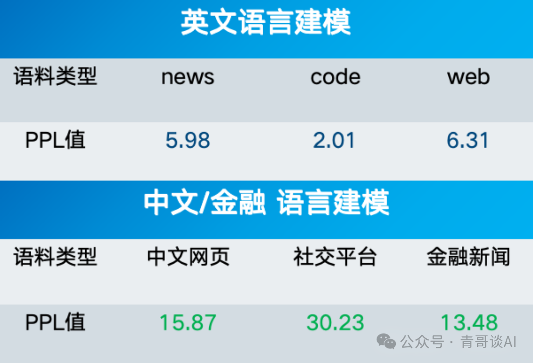 但当看中文数据时,情况就不相同了。中文网页的PPL值达到15.87,社交平台数据更是高达30.23,金融新闻也有13.48。这些高PPL值明确指出了基座模型在中文和金融领域的不足。如果基座模型能力较弱的话,后期通过SFT或者强化学习的难度就会变高,只能靠堆数据了。