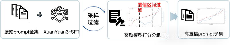 针对金融强化训练中的对齐税问题,可以对训练数据做置信区间过滤,以提高训练时的数据效率,稳定训练过程。实际上,并非所有的训练数据在RLHF过程中都能带来增益。例如,在一些特定prompt上,由于SFT模型的过拟合问题,即使设置了采样参数,也会导致模型生成的response过于“僵硬”,多次采样的结果相似度过高,且不符合人类的表达习惯。这部分数据难以在强化训练过程有效利用,反而会对模型的泛化性能产生负面影响。此外,已经有研究指出,奖励模型输出值过高或过低都会降低打分的置信程度,因此我们对原始数据进行了置信区间过滤。通过利用奖励模型对多次采样的SFT模型回复进行打分,并根据分数的均值和标准差进行排序分组,进而保留中间部分的置信度较高的prompt子集进行强化训练。