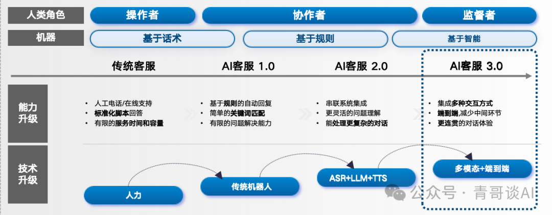进入了智能客服3.0时代是大模型在企业前台应用的重要成果。传统客服依赖于标准化脚本回答,服务时间和容量有限,而AI客服1.0则通过简单的关键词匹配来提供有限的问题解决能力。AI客服2.0通过串联系统集成,能更灵活地理解问题,处理更复杂的对话。然而,智能客服3.0时代的到来,使得客服行业实现了质的飞跃,集成了多种交互方式,减少了中间环节,提供了更连贯的对话体验。生成式AI技术的应用使得客服能够根据上下文生成个性化和创造性的回答,而不仅仅是基于预设规则的响应。这种技术进步不仅改变了客服的运作方式,也重塑了人类在客服场景中的角色。在智能客服3.0时代,人类的角色从此前的操作者、协作者转变为了监督者,能创造新的人机共生典范。