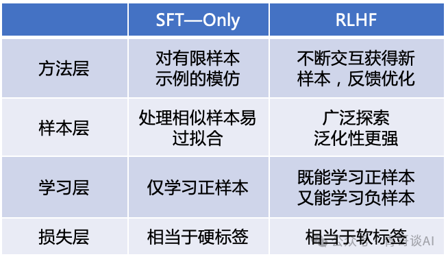 与SFT相比,RLHF方法提供了一种更动态、更有互动性的学习机制。SFT虽然在处理大规模标注数据方面效率较高,但它在应对新情境和复杂交互时常显不足。相对而言,RLHF通过不断的人机交互和反馈学习,使模型能够更加灵活地适应多变的场景和复杂的人类行为。表中列出了从方法、样本、学习原理和损失函数四个层面对两种方法的对比,可以看到,RLHF对高质量专家示例的需求更少,且有用偏好捕捉能力更强等特点。
