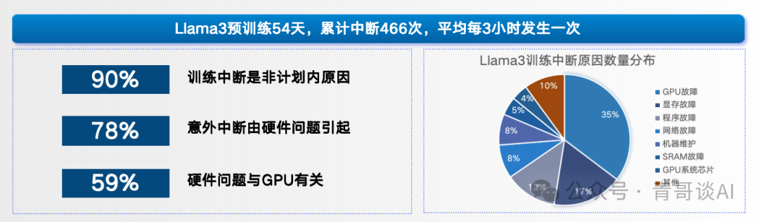 Llama3的预训练数据量大,时间长,集群规模大,故障发生频繁,大量的中断由非计划原因引起。任何平台都无法保证硬件和GPU的零故障率。Meta称Llama3在训练过程中累计中断466次,平均每3小时就发生一次。