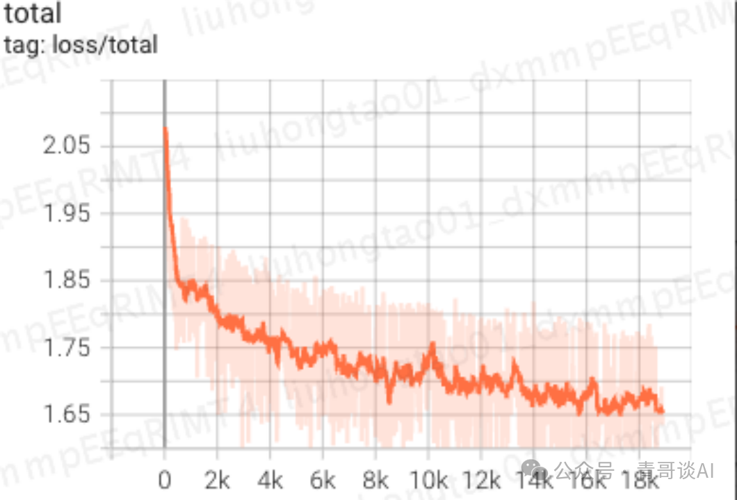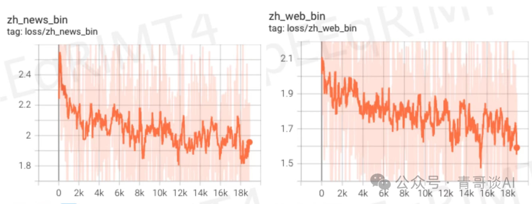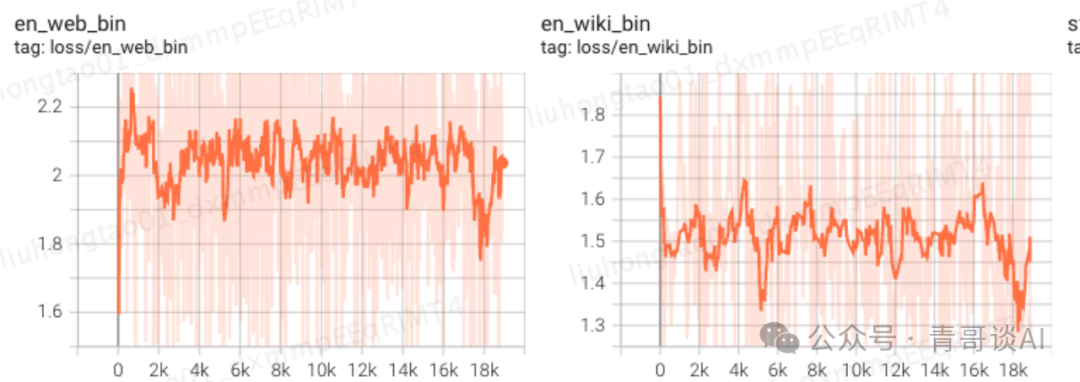 开始训练模型之后,最核心的就是对训练的loss进行分析和监控,以前可能就看一个全局的loss,只要loss在下降,就放心继续训练,然而这种方法, 根本不知道我们想要提升的中文和领域能力到底有没有提升。就算我们随便用一些中文数据拿来训练,损失也是会慢慢下降的。有人会问,增量预训练的过程中不能就看一个总体的平均loss吗?精细化的持续跟踪不同类型的loss,主要有两个目的,第一个明确下我们的中文和垂直领域数据是否在训练,从而可以调整数据配比,第二个是英文数据能力是否保持了,一般情况下,我们默认原始基座模型已经将英文语料训练的很充分(Llama3使用15T tokens)。
