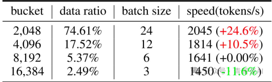 从上面的表格可以看到,这是我们一个13B模型的实验结果,训练数据中2k,4k,8k和16k的桶,首先大部分数据都在2k内,同时因为序列长度越短,训练速度越快,这种方法可以兼顾长短文本的建模,在数据组织层面上缓解拼接、截断概率,同时相比固定长度在训练效率上可以得到提升。通过这种分桶式混合长度训练策略,我们不仅能更好地处理各种长度的文本,减少信息损失,还能显著提高训练效率。这对于大规模语言模型的预训练至关重要。