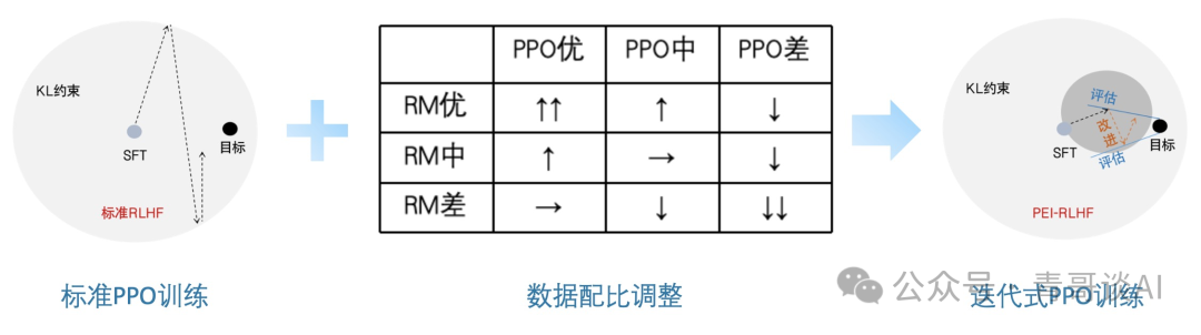 此外,迭代式的PPO训练方式可以在训练过程中动态调整数据配比和优化方向。与标准PPO在固定的约束邻域内的求解方式不同,迭代式PPO交替进行“改进”和“评估”两个步骤。在改进阶段,模型进行正常的PPO训练,并逐步增加KL散度的约束力度,从健步如飞到精细调控。在评估步骤,我们对比PPO相比与SFT模型的增益以及奖励模型对齐率的效果,并根据二者的关系调整数据配比,使得模型专精做每个改进阶段擅长的事。通过这样的方式,有的放矢调整训练方向,更大程度避免模型恶化,可以达到步步为营,减小对齐税的目的。