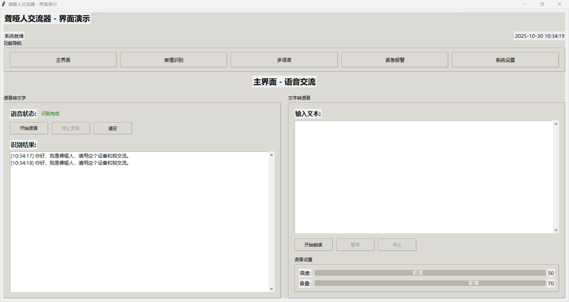 主界面是系统的核心,包含语音转文字和文字转语音的主要功能。界面采用左右分栏布局,左侧是语音转文字区域,右侧是文字转语音区域。每个区域都有清晰的功能标识和操作按钮。语音状态显示使用颜色编码,绿色表示正常,黄色表示处理中,红色表示错误。