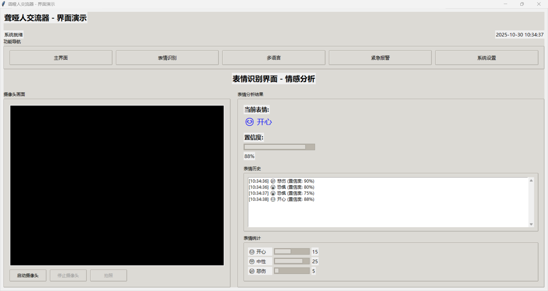 表情识别界面提供实时摄像头画面和表情分析结果。摄像头画面显示在左侧,表情分析结果显示在右侧。界面使用网格布局,确保信息显示清晰。表情置信度使用进度条显示,让用户能够直观了解识别结果的可信度。