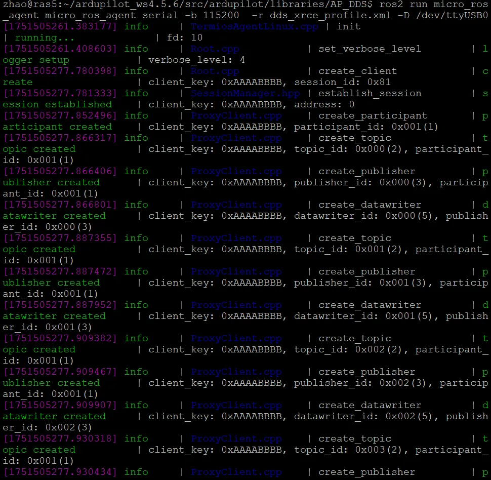 ~/ardupilot_ws4.5.6/src/ardupilot/libraries/AP_DDS$ ros2 run micro_ros_agent micro_ros_agent serial -b 115200 -r dds_xrce_profile.xml -D /dev/ttyUSB0