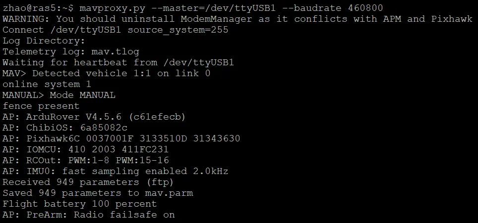 ~$ mavproxy.py --master=/dev/ttyUSB2 --baudrate 460800